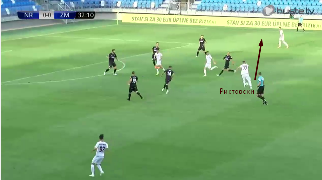 В этом матче во многом атаку определяет своими выходами в опорную соперника ЦН Ристовски. Он как бы становится дополнительным игроком в центре, что вынуждает соперника компактнее туда стягиваться и открывать фланги. Нитра может подавать в штрафную без особого давления. Это тот подходит к тому, что я сказал выше. Простой прием, если его так можно назвать, который облегчает задание, но никак не помогает игрокам развиваться, так как не требует правильной оценки ситуации, правильного мышления, правильного виденья поля и т.д.